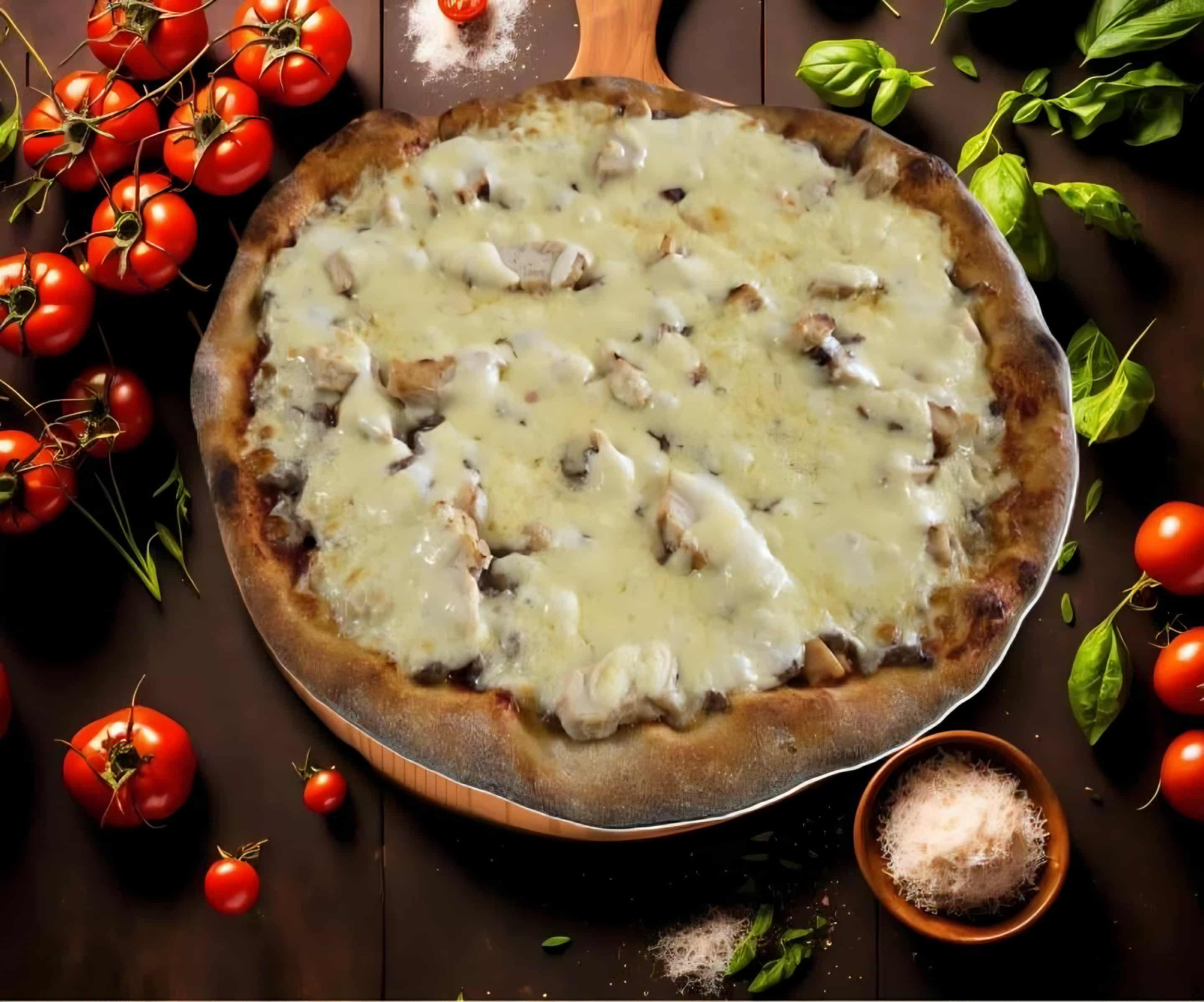 De la sauce tomate, de la viande hachée française 100 % pur boeuf, émincé de poulet grillé, de la mozzarella et une sauce fromagère extrêmement gourmande !