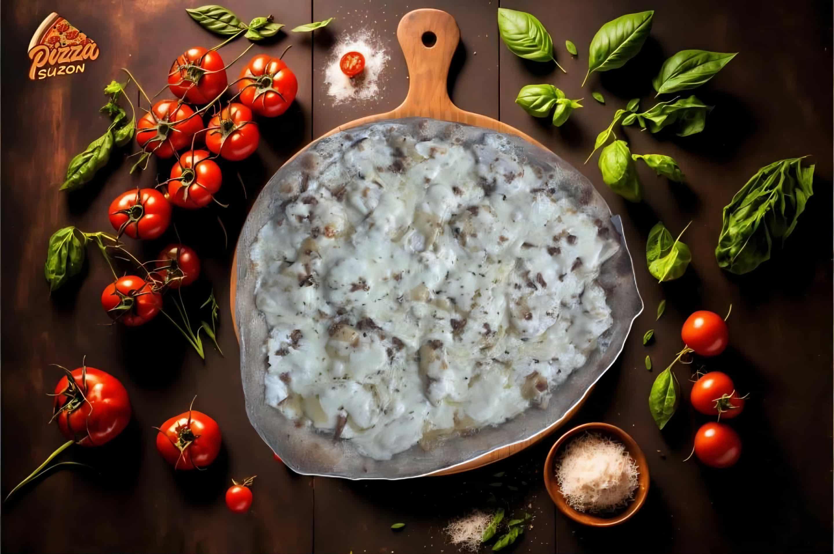 Nappé de crème fraîche, des émincés de poulet grillé, du cheddar, des oignons frits, une sauce blanche gourmande et de la mozzarella